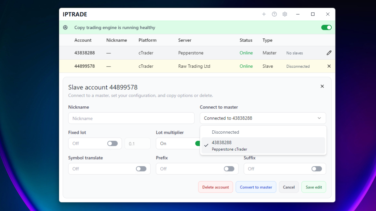 Yes. With IPTRADE Multi you can copy between MetaTrader 4, MetaTrader 5, and cTrader, across different brokers. Symbol translation, prefix/suffix, and lot size are handled automatically.