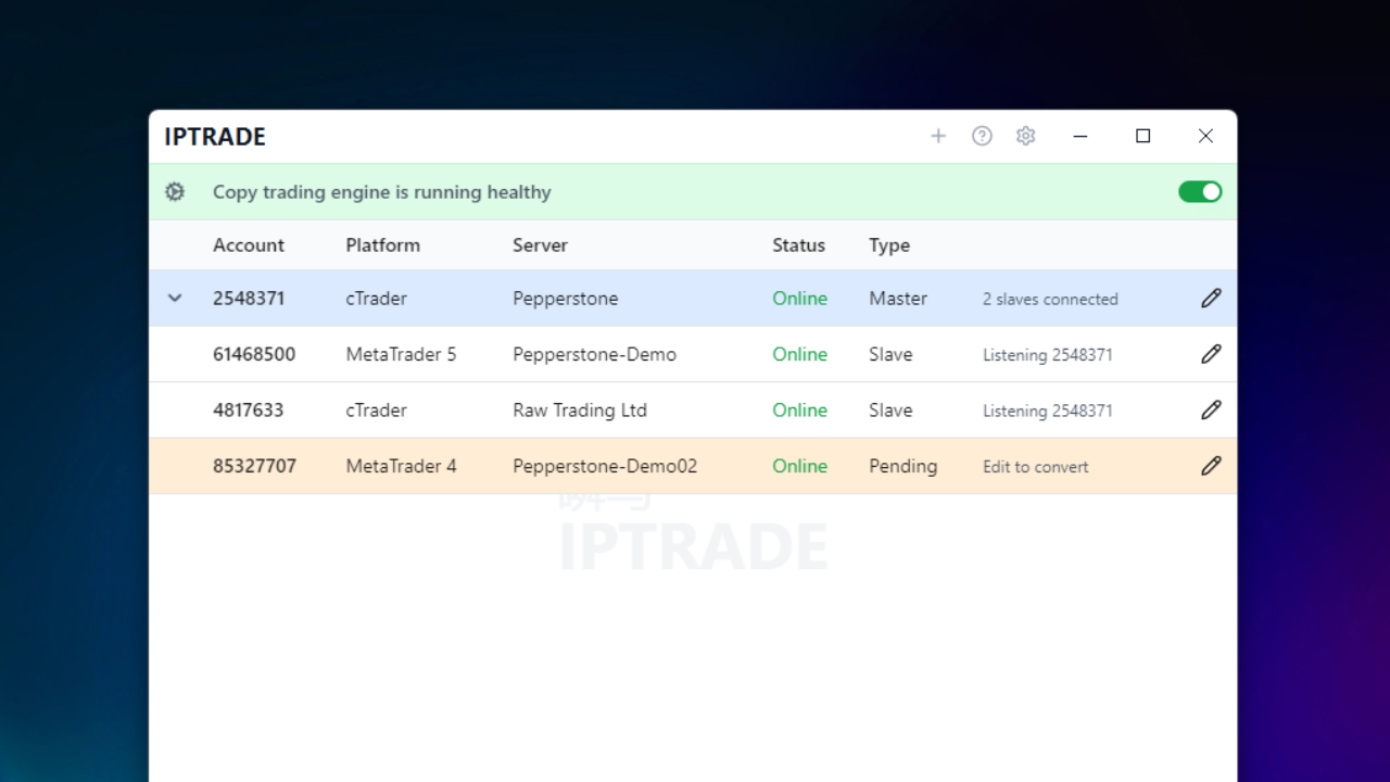 - Your own copy trading server — Set up IPTRADE on a VPS (any Windows VPS works) to run 24/7 with all your accounts connected. No need to keep your PC on—your copy trading server runs around the clock, copying trades automatically.