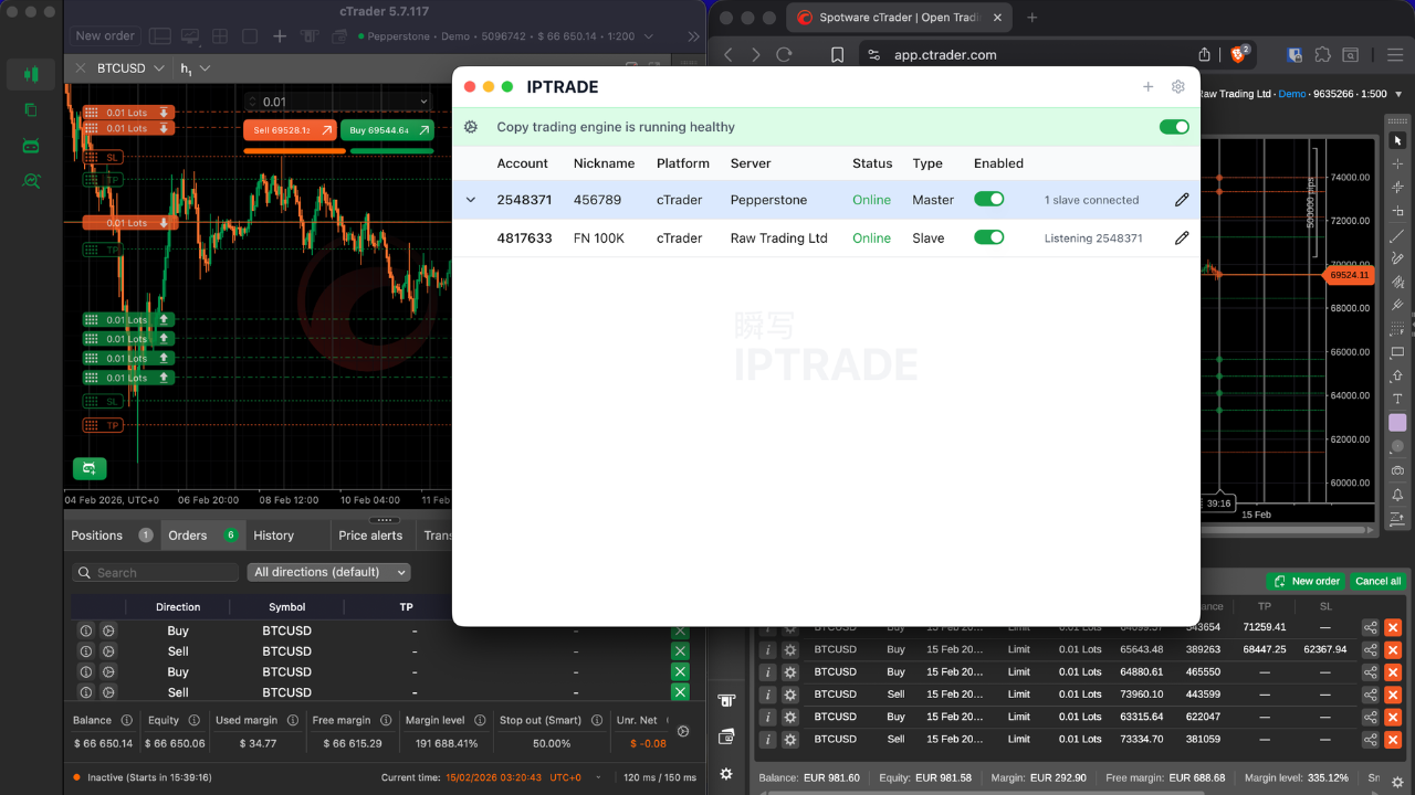 You set one account as Master (source) and others as Slaves (copiers). Trades are replicated in real time with zero added latency (TCP on your machine). IPTRADE Multi runs on your computer—all processing is local, with one IP for all accounts and no data sent to external servers.